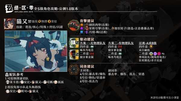 《绝区零》猫宫又奈输出非常强力,但是玩家们需要合理搭配她的音擎和驱动才能发挥出全部实力,想要知道如何培养的玩家请看下面“酸儒书生小课堂”带来的《绝区零》猫宫又奈培养攻略,希望能够帮助大家。