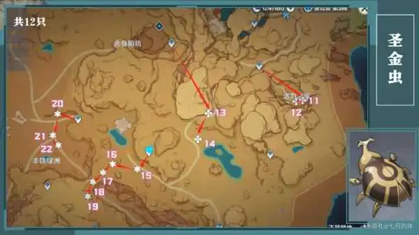 圣金虫很多都在地下遗迹内,大家如果没有开图,可以收集地面(六角星标记的),地面都很好找,就没有文字说明了;地下的都做了文字说明,非常详细了,按照文字描述对照参照物即可!