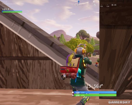 我们先要搭建斜板直接冲击对面所在的房屋,因为我们前期搜索的很快,所以护盾值都是满额状态,所以根本不怕这样的近身战斗,如图,我们进入房区的时候一定要从屋顶进入,因为从高打低比较容易,但从低打高就不占据优势,另外,我们两名玩家不要从屋顶的同一处位置进入,要在屋顶不同的两处位置进入,这样就能给敌人两个不同方位的夹击。