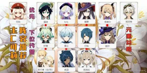可莉主C时,可带温迪,七七,莫娜,菲谢尔,也可带班尼特触发元素共鸣。