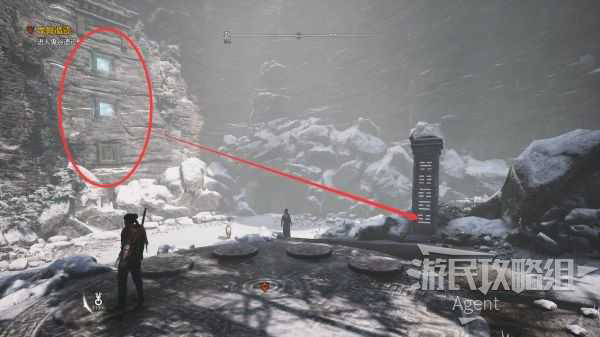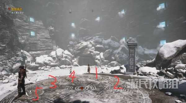 来到鬼谷雪地,鬼谷入口前解谜题。先依次踩踩地上的每个机关,记住它们与石碑上的对应的八卦符号。
