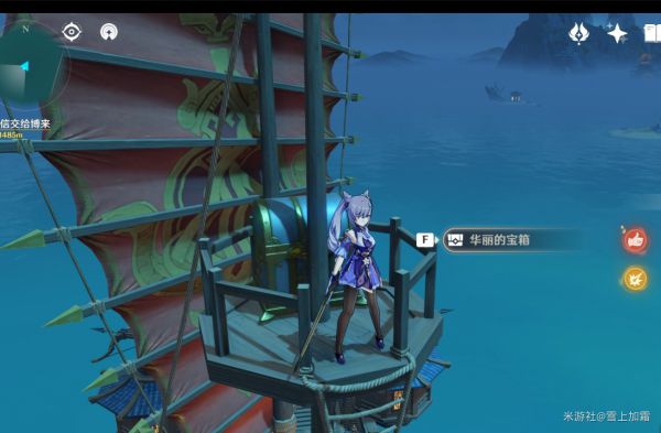 来到船上可以接到一个叫`孤舰履孤云`的小任务,和四个宝箱,三个宝箱在船的一头甲板上,另一个是“华丽宝箱”(华丽宝箱有概率开出四星圣遗物)。