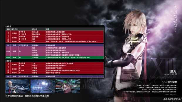 上图为官方中文出招表。雷光的属性是以速度为主的SPEED型,按下L3可以切换成攻击者与破坏者这两种职业,根据不同的状况,随时切换为使用剑进行近战攻击的攻击者或者使用魔法进行攻击的破坏者,是雷光最大的特点。