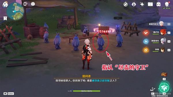 注意,这里由于雕像们站的很近,直接过去选无法分辨出哪个选项对应哪个角色,很容易选错,建议来我下图的位置,贴着墙一点点挪到只能选到“盗宝团「呱」”的位置再进行指认。