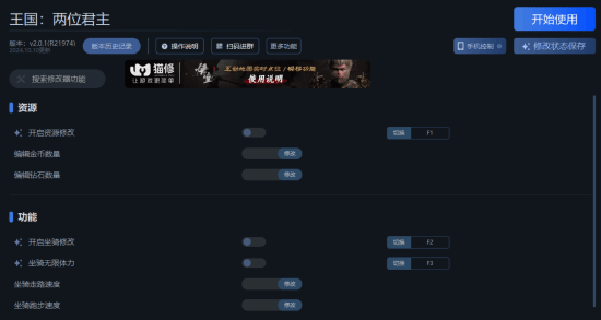 《王国:两位君主》一修大师修改器支持资源、坐骑、体力等功能修改。