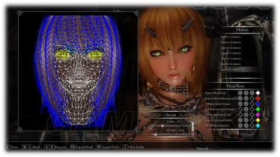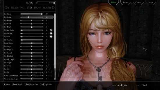 长相也因为 ENB 或光影 MOD 不同有所差异,这和随从往往看起来和预览图不同是一样道理的。接下来就是你要发挥萝~~~眼睛、眉毛、头髮、化妆、纹身等等,抑或是脸的 细部微调,改成你喜欢的样子。