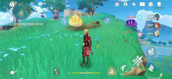 如图所示,我们需要让角色在指定区域附着15秒的火元素,附着火元素的同时可以观察底下的「素材收集器」来完成火元素附着。建议可以站在烈焰花的旁边来完成附着。