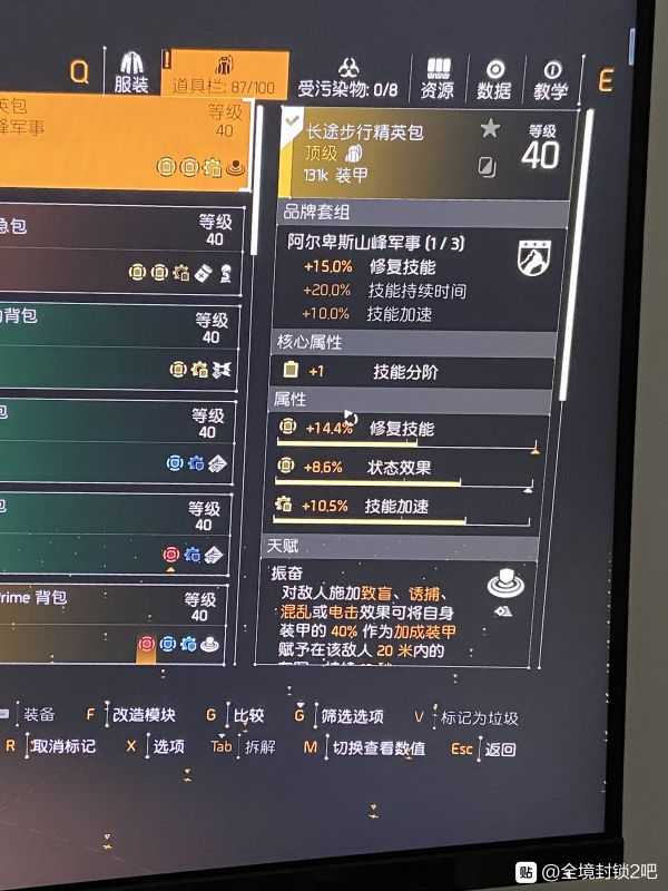 《全境封锁2》游戏中玩家能够选择一些偏向于团队生存的玩法,能够让队友在战斗中的容错率更高,下面请看玩家“JAZZQAQ”分享的《全境封锁2》TU8团队叠甲控制流电工配装。希望能为各位玩家带来一些帮助。