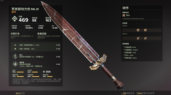 3.至于为何把普通伤害和劈裂排到后面,个人认为老兵拔出动力剑的时候默认是按下充能再开始砍,那么本身五维的那几点伤害差距是非常不明显的,机动性的话看个人感觉,闪避距离的多少与前者几个五维相比显得一般重要。