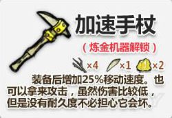 加速杖可当作弱版的备用武器来用,尽管它的攻击力只是长矛的一半,当武器用却无限耐久度,同时提供使用者高速打带跑的能力,也可用来杀高速的小型生物,像是蝴蝶、地鼠。加速杖可以合成探险法杖、瞬移手杖。