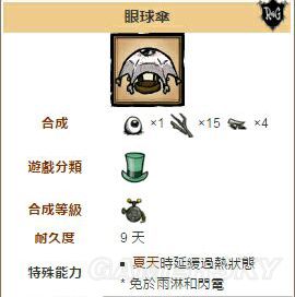 眼球伞需要1个鹿角怪眼球,15个树枝和4个骨头碎片来合成,以及炼金引擎来生成样板。使用针线包能修复其55.5%耐久度。它对于过热状态能提供出色的保护,且对于雨天和闪电则是绝对免疫。