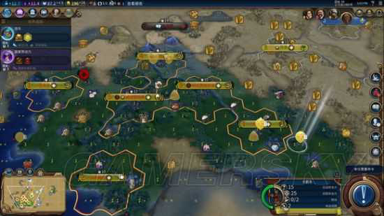 39T已经铺开五个城,首都还有2T又出来一个移民,因为踩到遗物和首发军事城邦以及首都锤子还可以的原因,前期铺城特别快,另外注意右边的萨拉丁,这货非常执着要在我右下角有钻石那个地方坐城,导致被我抢了两个移民,这也是超出我意外的事情,右边两个城就是他送的,另一边法国和美国拍他脸导致本局他玩了一把单城挑战