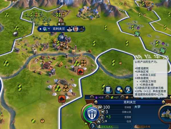 比如上图的克利夫兰,就是很典型的工业-市中心-水渠三角,然后相邻矿+矿战略,这样完成水渠之后,工业相邻会达到6,挂卡12,非常舒服
