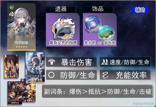 1.布洛妮娅的初始速度99点,加上副词条有速度能达120以上的话(有队友提速也行),戴饰品【生命的翁瓦克】。达不到就戴速度鞋,饰品戴【星体差分机】。