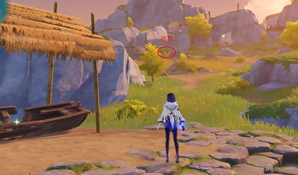 然后朝东南方向,一棵死树前方,茅草棚下有一艘破船(圣遗物),两个木桶(食材)。