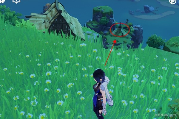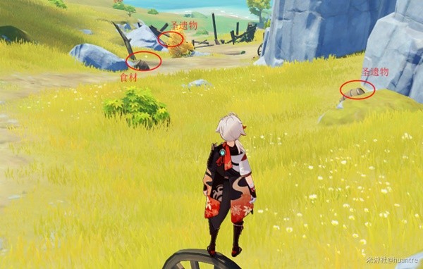 七天神像出来,往右偏后一点飞,有一个帐篷,右边的调查点是(圣遗物),左边的是(食材)。