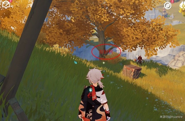 传送锚点出来,朝东南方向,穿过几棵却砂树,稻草人附近有一根柱子,柱子旁边有一个小木箱(调查点)。