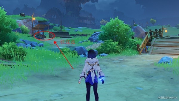 七天神像出来,往前走过石拱桥,石拱桥中间有一堆杂物(摩拉),前方客栈一边是箱子(调查点),一边是酒坛子(调查点)。