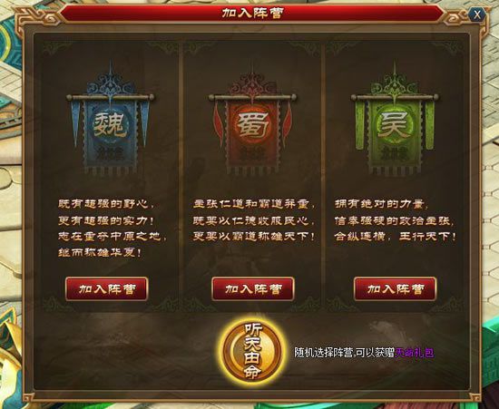 当阵营功能开启后,玩家可到龙城找盟军阵营官选择一个阵营加入,还可以选择听天由命,随机分配一个阵营,并获得听天由命礼包,内含丰厚奖励。