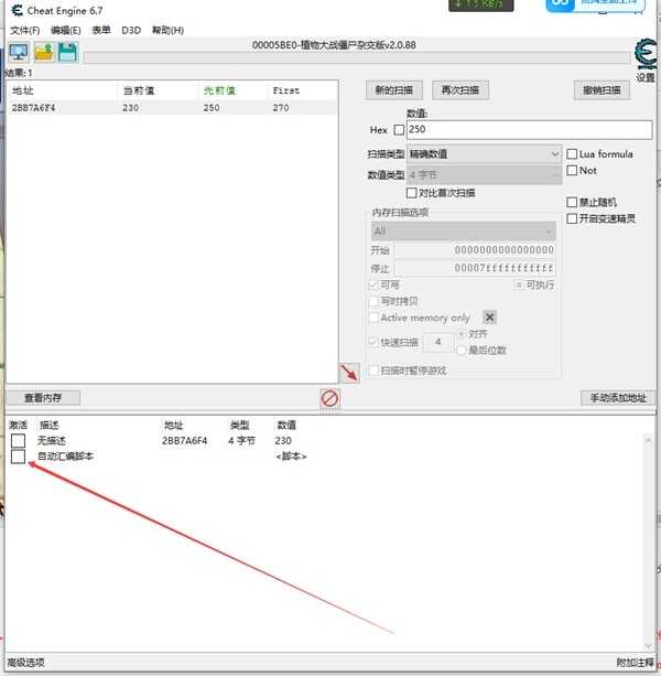 然后就把当前开的小窗口都关闭了,回到CE修改器的主页面,就可以看到下面有一个自动汇编脚本。
