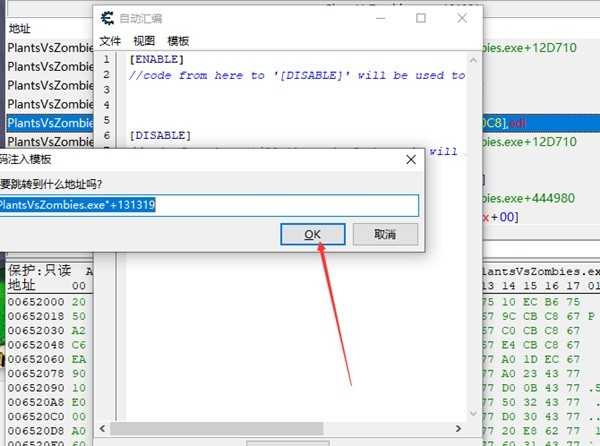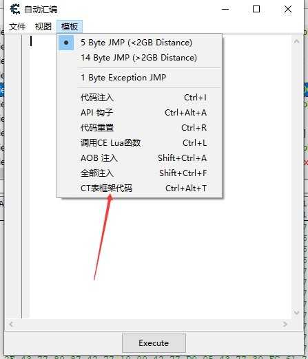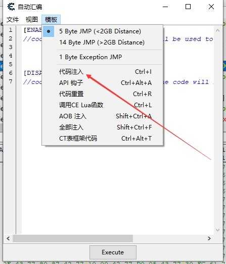 自动汇编窗口打开后,我们先 模块→CT表框架代码,然后,再 模块→代码注入,再然后OK。