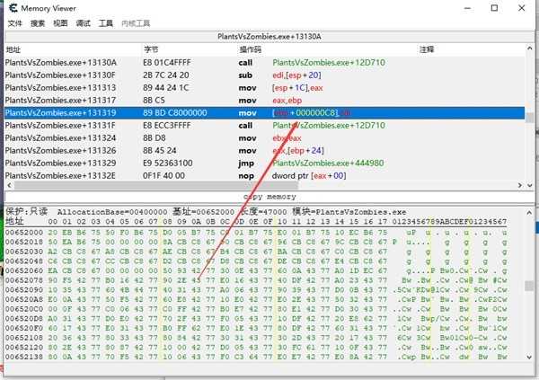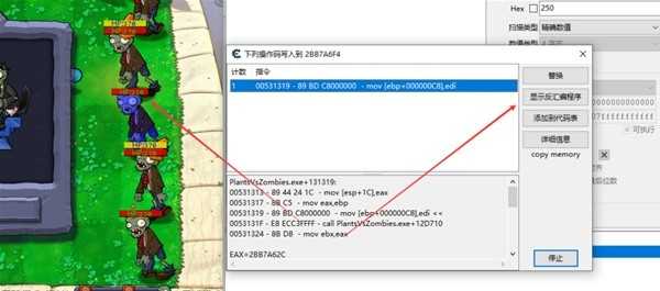 我们回到游戏,让植物攻击僵尸后,僵尸掉血,我们得到了改写僵尸HP的代码,然后:显示反汇编程序。