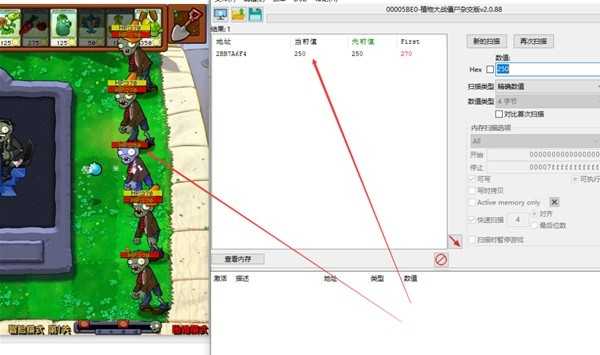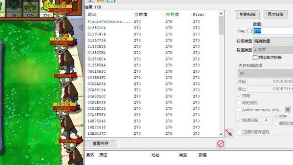 搜索了以后,我们种个植物,打僵尸掉血,继续搜索,精准搜索到了一个僵尸的HP。
