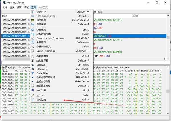到了反汇编程序界面后,已经默认选择的这个地址,不要乱动,然后点 工具→自动汇编。