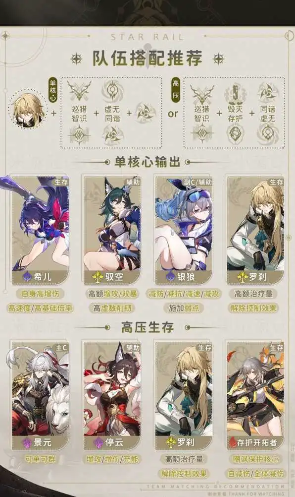 由于战技能在其回合外额外触发的机制,使得罗刹是目前“丰饶”角色里对战技点依赖最低的角色,这份优势可以转化为队伍搭配上的一种优势。下面简单提一下队伍搭配以及角色定位。