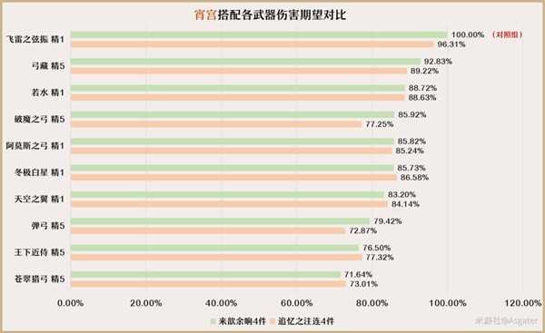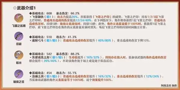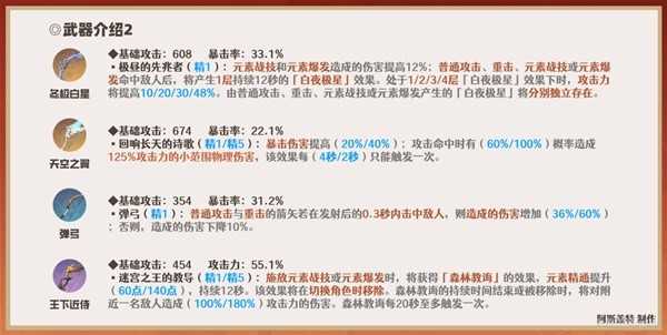 ②.弓藏:该武器在满级精练时可以获得80%的普攻增伤,满精炼时其在伤害期望上位于第二位,该武器副属性为攻击力,圣遗物主要堆叠暴击率、暴击伤害。