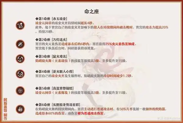 ◆总的来说,除6命外的命座提升都较小,非真爱党不推荐考虑专门抽取,其0命已经具备较为完整的输出机制。如果是宵宫真爱党,且愿意为其抽取命座,推荐以6命为目标进行抽取,解锁宵宫的“火焰加特林”玩法!