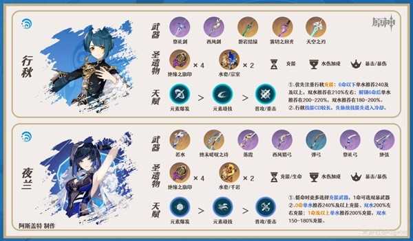 ②.云堇/班尼特的位置也可替换为行秋,此时“夜兰+行秋”可以考虑降低充能效率、增加伤害词条来提高双水组合的脱手水元素伤害。
