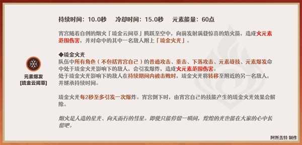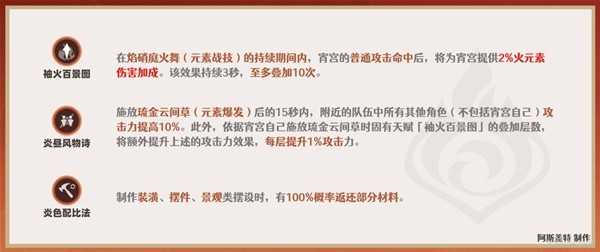 ②.元素爆发的施放攻击命中敌人时将施加强火元素附着(2元素量、12秒),后续琉金火光的火伤施加弱火元素附着。