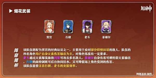 ①.当前版本下,具有高额伤害的敌人较多(如各类圣骸兽),在选择烟花武装时,其行秋、北斗的减伤、抗打断效果可能并不理想,需要谨慎选择。