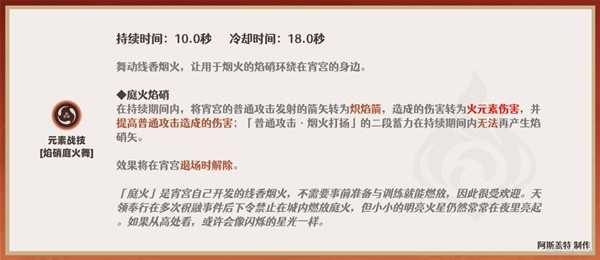①.施放元素战技后,普通攻击将转化为火元素伤害,这时普攻命中敌人将产生1颗火元素微粒,冷却时间2秒。
