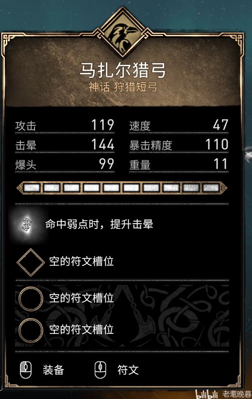 马扎尔猎弓为狩猎短弓,初得时为无暇品质,可升级至神话品质。