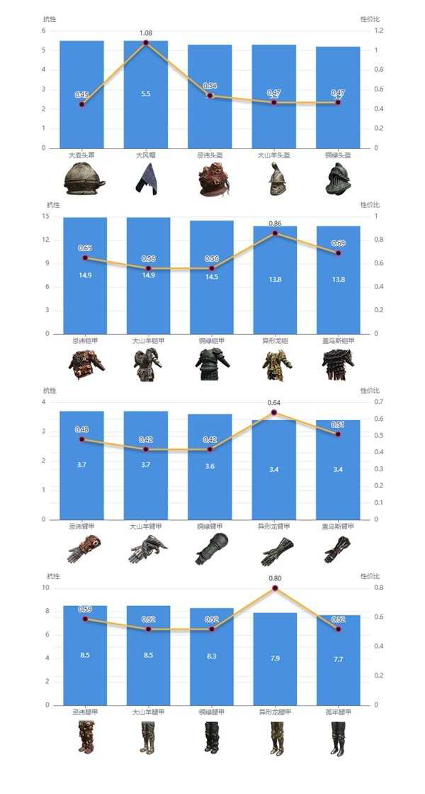 性价比路线:忌讳头盔+异形龙铠+异形龙臂甲+异形龙腿甲=41.1负重/30.4雷抗