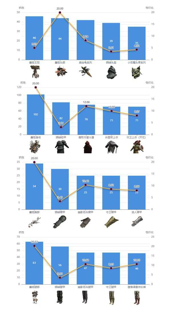 性价比路线:大树守卫头盔+大树守卫铠甲(轻装)+大树守卫臂甲+大树守卫腿甲=44.2负重/36.8火抗