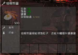 看看它的指标,健康+1且无副作用,连味道都不会散发,再看看制作它只需要锅+烤架+2蛋1肉,综合来看,它是首选食物。