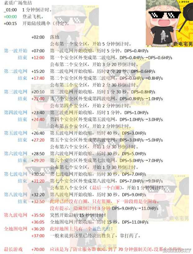 在《绝地求生》中,这个机制演化成了电网机制(还有轰炸区机制),不论是毒气还是电网反正都是一个意思,即随着时间地推移,游戏中的安全区域会越来越小,玩家必须在规定的时间范围内进入安全区,否则就将被淘汰出局。这就是《绝地求生》的核心玩法之一。