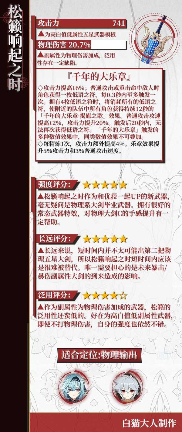 新武器松赖响起之时,作为一把极高白值极低副属性武器,它有741的白值与20.7%的物理伤害加成。武器被动和特效触发时一共有36%的攻击力和10%的攻速加成。其中攻速加成的收益并不明显,在测试循环中仅能让优菈多吃到一层大招Buff,10s的循环中输出提升不到3%,但是这3%不会被稀释。在优秀的白值、物攻、攻击、攻速多项加成下,松籁响起之时是优菈最好用也是综合强度最高的武器。