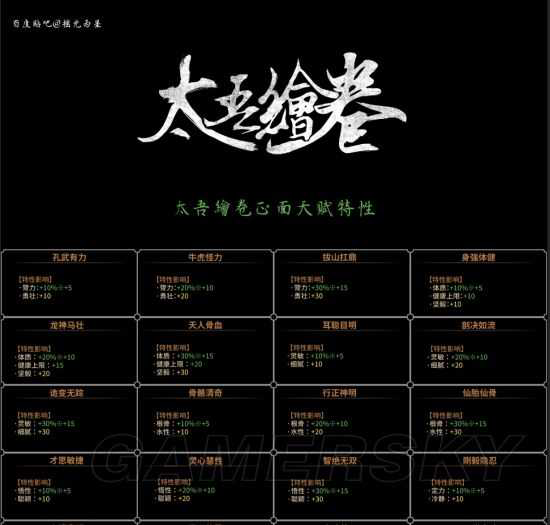 《太吾绘卷》有着许许多多的天赋和特性,每个都有独特的增、减益效果,下面小编为大家带来《太吾绘卷》全天赋、特性效果一图流汇总,方便大家查看。