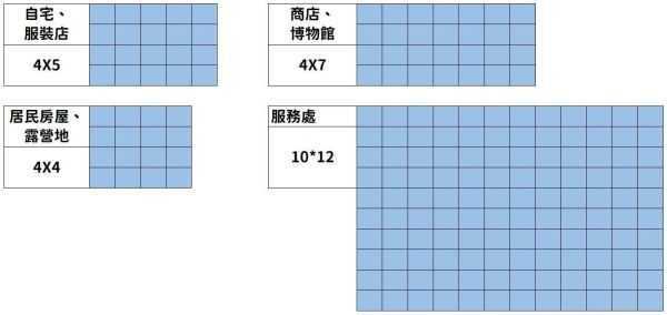 开始动工时,大家可以参考一下各建筑占地的格子大小。要注意每个建筑前都要预留一排走路的地方。这边建议可以使用我的设计,先将画布涂满全透明,然后在四边画线,做出一个预定格子的图样,就可以帮助我们预留建筑的位置。