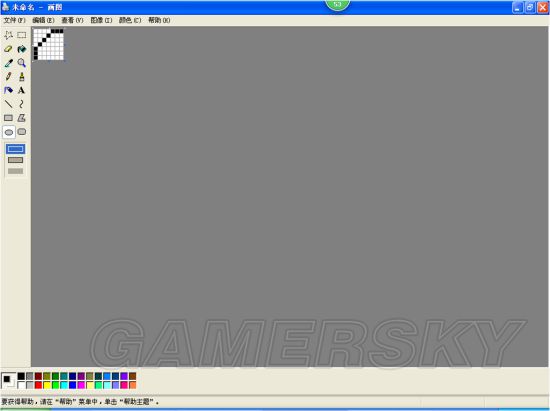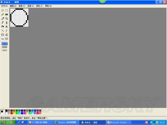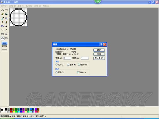 Step6:在画布中从左上角第一像素到右下角最后一像素画一个圆。(会有不规则圆的情况发生,使用shift键有效避免)并在圆中选取最正常的部分(7x7,至少这里是!)用【方形选区】功能拖拽到左上角。注意不要让像素超出画布,会被吃掉的?!