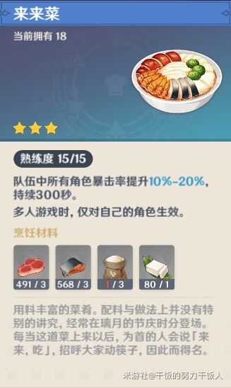 点评:极强的攻击性食物,无论是否特色料理,都能提供任意C位非常需要的属性. 在这为什么推荐来来菜并没有推荐堆高高,因为堆高高需要小灯草(等级突破素材),小灯草采集太困难,和鱼肉比起来,小灯草显得捉襟见肘