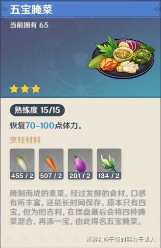 点评:五宝腌菜的阉割版,在没有开稻妻地图之前,身上备上十个总没错. 为什么是十个?因为猎鹿人卖的熏禽肉一周就十个...