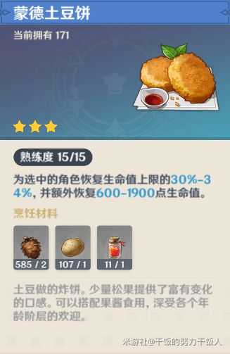 三星食谱:蒙德土豆饼(北风之狼的庙宇秘境获得)