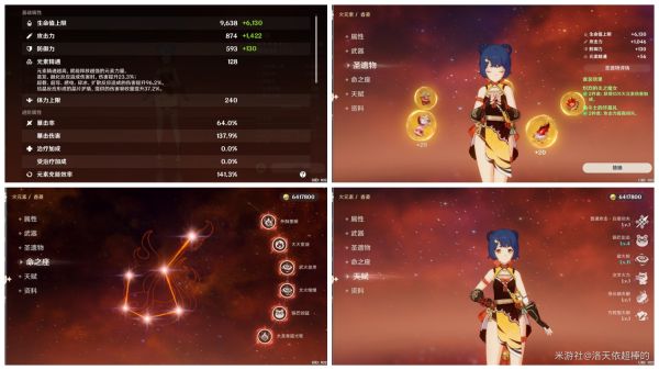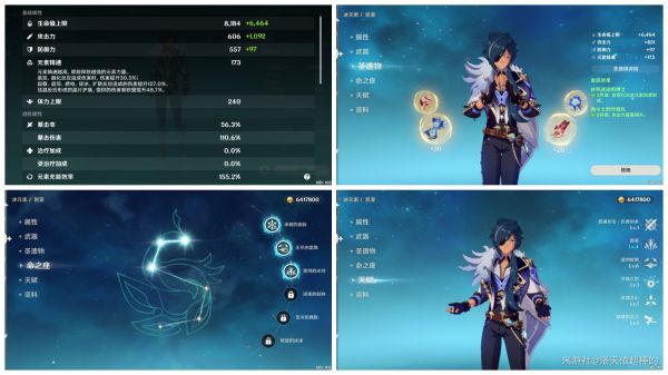 行秋∶81级,祭礼行秋,输出定位,167充能与祭礼特效双E保证Q技能循环,圣遗物水2+角斗士2增强输出能力。