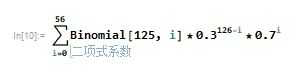 接下来我们讨论第二种角度“给定56发子弹,能发射超过126发子弹的概率是多少”,假设发射的子弹为n, i>=56, 这个问题是典型的插板问题,我们先要把i切分为56个部分,每个部分至少为1,那么切分情况为C(i-1, 55),每种的概率为C(i-1, 55)*0.3^(n-56)*0.7^(56),累加级数和为: