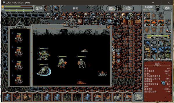 巫妖无了之后,第一个比较难的点是镜子boss,虽然说巫妖是镜子的爹,可以让骷髅去吃伤害,但是一般流畅拍建筑都会在5-6loop见到这个boss,这个时候我们的森林河流也拍的差不多,攻速有80%-100%加成,3个骷髅对于打这个boss有点难度,要让攻速最大化利用就要有上限4的骷髅数量,首先是减少被打概率,其次增加输出(有时候骷髅等级换骷髅数量也是会增加战力的)。